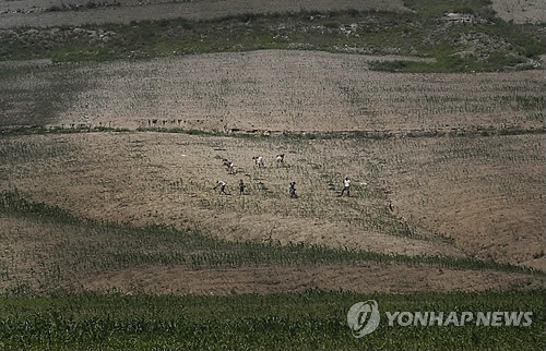 | △ 가뭄 속 밭일하는 北 농부 (평양 AP=연합뉴스) 북한 황해남도의 비탈진 곳에 조성된 한 옥수수 밭에서 24일 농부들이 밭일을 하고 있다. 북한은 올들어 예년에 보기 드문 가뭄으로 인해 흉년과 식량부족 현상을 맞을 수 있을 것으로 보인다. marshal@yna.co.kr Farmers are dwarfed against a hill as they work in a corn field, Wednesday, June 24, 2015 in South Hwanghae, North Korea. North Korea may be facing a poor harvest and possible food shortages due to unusually light rainfall in some parts of the country so far this year. (AP Photo/Wong Maye-E) |