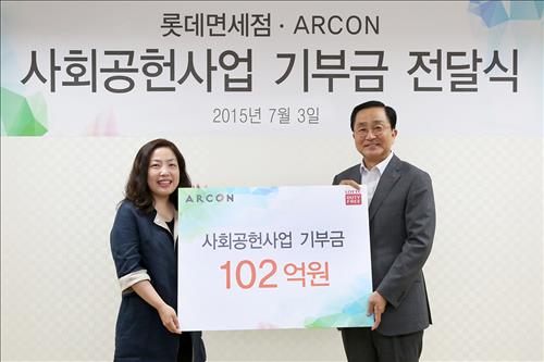(서울=연합뉴스) 인교준 기자 = 롯데면세점은 3일 서울 명동의 본사 대회의실에서 비영리기관인 문화예술사회공헌네트워크(아르콘)에 사회공헌사업을 위한 기부금으로 102억원을 전달했다고 밝혔다.