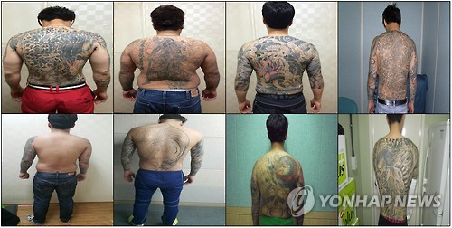 △ 문신한 '구리식구파'     경기 남양주경찰서는 폭력조직 '구리식구파' 두목과 조직원을 합쳐 70명을 검거했다고 3일 밝혔다. 사진은 조직폭력배가 위력을 과시하려고 몸에 문신한 모습들. 2015.7.3 <<남양주경찰서 제공>>