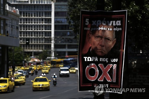 △ (AP=연합뉴스) 그리스 수도 아테네의 신타그마 광장에 '국민투표에서 채권단의 요구에 반대해야 한다'는 내용의 포스터가 부착돼 있다.