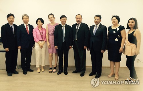 | △ 상명대ㆍ카스피안대, 복수학위 인정 등 교류 논의 (알마티=연합뉴스) 김현태 특파원 = 상명대학교와 카자흐스탄의 카스피안대학교가 3일(현지시간) 양교 교류협력을 논의했다. 이날 카자흐 최대 도시 알마티의 카스피안대에서 열린 회의에서 양교는 학생-교수 교류, 복수학위, 카스피언대 교수 상명대 박사학위 수학건 등의 진행방향에 대해 얘기를 나눴다. 사진은 구기헌 상명대 총장(왼쪽에서 다섯번째), 졸다스벡 누세노프 카스피안대 총장(왼쪽에서 여섯번째) 등 참석자들이 기념사진을 찍는 모습. 2015.7.3 mtkht@yna.co.kr |