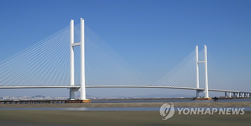 | △ 완공을 눈 앞에 둔 북한 신의주와 중국 단둥을 연결하는 신압록강대교의 모습. 2014.10.16 |
