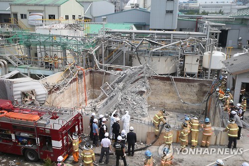 | △ 한화케미칼 사고 현장서 국과수 현장감식 (울산=연합뉴스) 이상현 기자 = 3일 7명의 사상자를 낸 울산시 남구 여천동 한화케미칼 폐수집수장 폭발 사고 현장에서 국립과학수사연구소 관계자(가운데)들이 현장감식을 하고 있다. 2015.7.3 leeyoo@yna.co.kr |