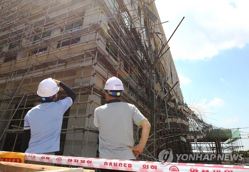 | △ 사고현장 살펴보는 안전보건공단 관계자 (천안=연합뉴스) 이재림 기자 = 4일 충남 천안시 백석문화대 외식산업관 신축 공사장에서 임시 가설물(비계)이 무너져 작업중이던 근로자 7명이 추락, 3명이 숨지고 4명이 중경상을 입었다. 안전보건공단 관계자가 사고 현장을 살펴보고 있다. 2015.7.4 walden@yna.co.kr |