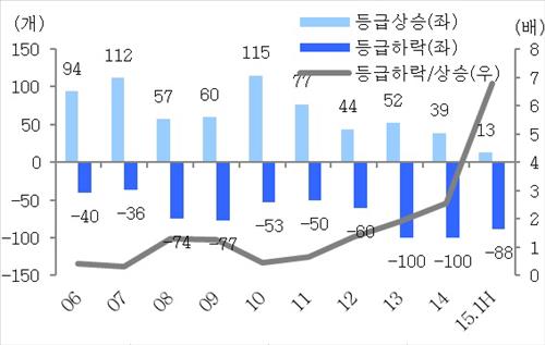 이에 따라 등급 상승 업체 대비 하락 업체 배율도 2010년 0.5배에서 올해 상반기는 6.8배로 확대됐다.