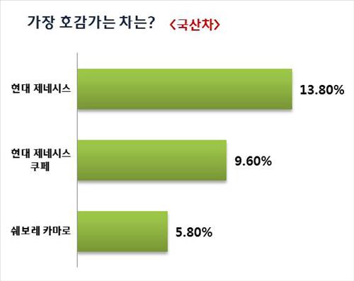 국산차로는 제네시스(13.8%)에 이어 제네시스 쿠페(9.6%), 쉐보레 카마로(5.8%) 순으로 호감도가 높았다. 수입차로는 아우디 A7(7.5%), 랜드로버 레인지로버 이보크(4.6%), 폴크스바겐 비틀(4.2%) 순으로 나타났다.