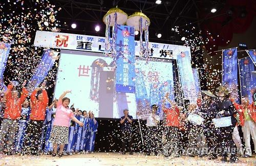 △ 일본 정부가 추천한 23개 산업 시설이 5일 세계유산에 등재되자 이 소식을 전해 들은 주민들이 시즈오카(靜岡)현 이즈노쿠니(伊豆の國)시에서 미리 준비한 축하용 소품을 터뜨리면서 환호하고 있다. (교도=연합뉴스)