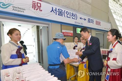 | △ (영종도 공항사진기자단=연합뉴스) 김수천 아시아나항공 사장이 30일 오전 인천국제공항 여객터미널에서 아시아나항공 로마 직항 노선 신규 취항을 기념해 첫 로마행 승객에게 기념품을 나눠주고 있다. 아시아나항공은 이날부터 인천과 로마를 오가는 직항편을 화·목·토요일 주 3차례 운영하기로 했다. 2015.6.30 |