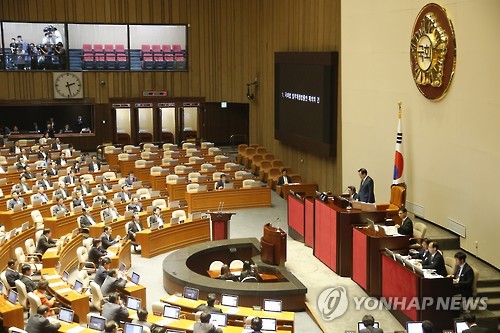 | △ 국회법 개정안 재의안 본회의 상정 (서울=연합뉴스)이상학 기자 = 6일 국회 본회의에서 '국회법 일부개정법률안 재의의 건'이 상정되고 있다. |