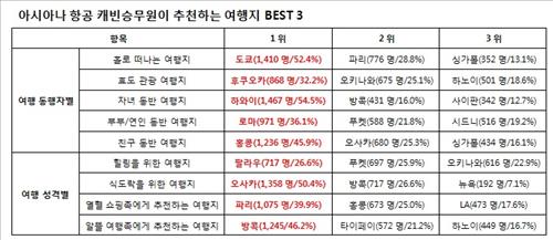 (서울=연합뉴스) 성혜미 기자 = 아시아나항공[020560]이 여름휴가 시즌을 맞아 객실 승무원 2천692명을 대상으로 추천 여행지를 설문조사한 결과를 7일 발표했다.