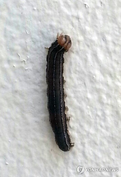 (고창=연합뉴스) 김진방 기자 = 전북 김제의 주택가와 초등학교에서 무더기로 출현한 멸강나방(학명 Pseudaletia separata) 유충인 '멸강충'이 고창에서도 발견됐다.