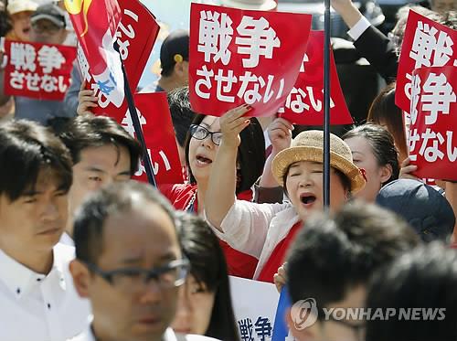 △ 2015년 5월 14일 일본 도쿄도(東京都) 지요다(千代田)구 총리관저 인근에서 아베 신조(安倍晋三) 정권의 안보법제 정비에 반대하는 시민들이 시위를 하고 있다.(교도=연합뉴스 자료사진)