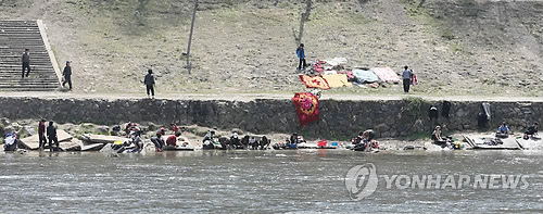 △ 북한 양강도 혜산시 주민들이 압록강변에서 빨래를 하고 있다.