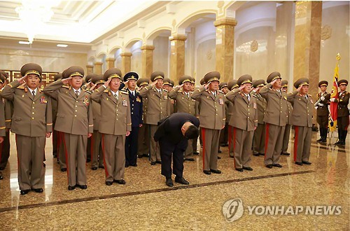 | △ 북한 김정은, 김일성 21주기 맞아 금수산태양궁전 참배 (서울=연합뉴스) 김정은 북한 국방위원회 제1위원장이 김일성 주석 사망 21주기인 8일 0시 인민군 간부들을 대동하고 김일성 주석의 시신이 안치된 금수산태양궁전을 참배했다. 김정은 제1위원장의 오른쪽부터 황병서 군 총정치국장, 리영길 총참모장, 조남진 중장, 렴철성 총정치국 선전부국장 순으로, 왼쪽부터는 박영식 대장, 김원홍 국가안전보위부장, 노광철 부총참모장, 서홍찬 인민무력부 제1부부장 순으로 도열했다. 2015. 7. 8 nkphoto@yna.co.kr |