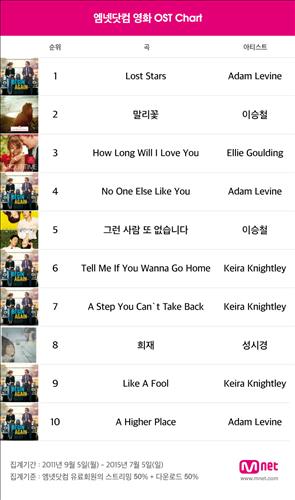 8일 CJ E&M이 운영하는 엠넷닷컴에 따르면 영화음악 OST(오리지널사운드트랙) 차트가 신설된 2011년 9월 5일부터 2015년 7월 5일까지 약 1천400일간의 음원판매량(스트리밍+다운로드)을 집계한 결과 마룬5의 보컬 애덤 리바인이 부른 '로스트 스타즈'가 영화음악 종합차트 1위를 차지했다.