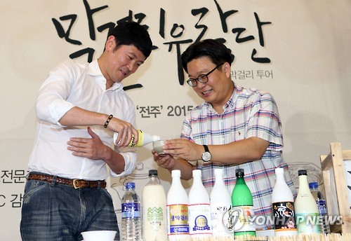 | △ 추승균 감독과 서경덕 교수 막걸리 시식 (전주=연합뉴스) 최영수 기자 = 한식홍보전문가 서경덕 성신여대 교수(오른쪽)가 8일 오후 전북 전주시 남부시장 내 청년몰에서 연 '막걸리 유랑단 파티'에서 추승균 KCC 감독과 막걸리를 서로 따라주고 있다. 2015.7.8 kan@yna.co.kr |