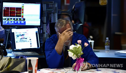 | △ 악재가 겹치는군 (뉴욕 EPA=연합뉴스) 8일(현지시간) 미국 뉴욕증권거래소 기술적 문제로 4시간 가까이 거래가 중단되는 사고가 발생하자 한 트레이더가 테이블에 앉아 이마를 감싸쥐고 있다. |