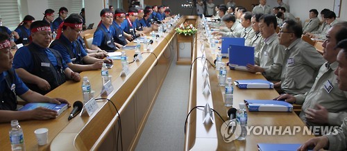 | △ 현대차 노사 2015 임단협 첫 상견례 (울산=연합뉴스) 장영은 기자 = 현대자동차 노사는 2일 울산공장 아반떼룸에서 윤갑한 사장과 이경훈 노조위원장(지부장) 등 노사 교섭대표 50여 명이 참석한 가운데 올해 임금과 단체협약 교섭을 위한 첫 상견례를 열었다.2015.6.2 young@yna.co.kr |