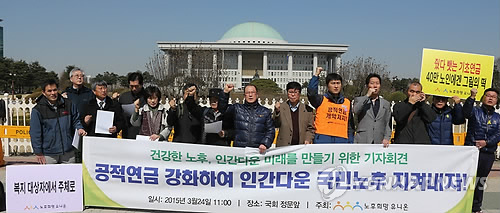 △ 노후연금 보장 촉구 기자회견 (서울=연합뉴스) 백승렬 기자 = 노후희망유니온 회원들이 24일 국회 정문 앞에서 노후연금 보장을 촉구하는 기자회견을 하고 있다. 2015.3.24 srbaek@yna.co.kr