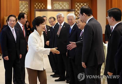 | △ 박근혜 대통령이 2014년 10월 24일 청와대에서 일한의원연맹 대표단을 접견하며 인사하는 모습. |