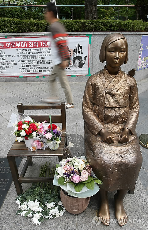 △ 소녀상과 카네이션 (서울=연합뉴스) 한종찬 기자 = 6일 오후 서울 종로구 주한일본대사관 앞에 설치된 소녀상 옆에 카네이션이 놓여있다. 2015.5.6 saba@yna.co.kr