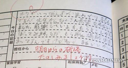 △ (이와테 교도=연합뉴스) 집단 괴롭힘에 시달리다 자살한 것으로 추정되는 중학생 마쓰무라 료 군이 담임교사에게 하루를 돌아보는 내용을 적어 제출하는 노트에 '이미 죽을('市ぬ'는 '死ぬ'의 오기로 추정됨) 장소는 정해져 있다'는 내용이 기재돼 있다. 담임교사는 '내일부터 (예정된) 연수를 즐기자' 붉은 글씨로 답변했다. 2015.7.9 sewonlee@yna.co.kr (끝)