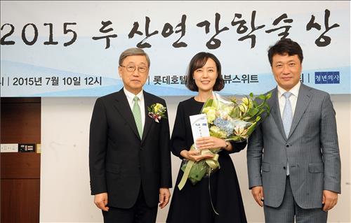 (서울=연합뉴스) 고웅석 기자 = 두산연강재단(이사장 박용현)은 10일 서울 소공동 롯데호텔에서 2015 두산연강학술상 의학논문 부문 시상식을 열고 수상자인 김미나 조교수(강남차병원 소화기내과)에게 상금 2천만원과 상패를 수여했다고 밝혔다.