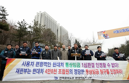 | △ 현대차 노조, 통상임금 소송 항소장 제출 (서울=연합뉴스) 신준희 기자 = 29일 오전 서초동 서울고등법원 앞에서 금속노조 현대자동차지부 조합원들이 '사용자 편향적인 통상임금 1심판결은 인정할 수 없다'며 항소장 제출 기자회견을 하고 있다. 2015.1.29 hama@yna.co.kr |