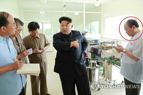 | △ 북한 김정은 김가공공장 현지지도…'금고지기' 전일춘 수행 (서울=연합뉴스) 북한 김정은 국방위원회 제1위원장이 평양대경김가공공장을 현지지도했다고 노동당 기관지 노동신문이 11일 보도했다. 현지지도에는 황병서 총정치국장, 서홍찬 인민무력부 제1부부장, 리재일·전일춘 당 제1부부장, 조용원 당 부부장이 수행했다. 사진속 붉은 원은 노동당 39호실 실장으로 알려진 '김정은 금고지기' 전일춘. 그가 북한 공식 행사에 모습을 드러낸 것은 지난 2월 당중앙위원회 정치국 확대회의 이후 5개월 만이다. 2015.7.11 nkphoto@yna.co.kr |