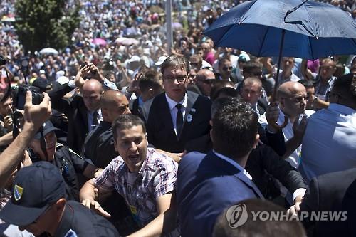 (스레브레니차<보스니아-헤르체고비나> AP=연합뉴스) 알렉산다르 부시치 세르비아 총리가 11일 보스니아-헤르체고비나에서 열린 '스레브레니차 학살' 20주년 추모행사에 참석했다가 성난 군중으로부터 돌을 맞는 봉변을 당했다.