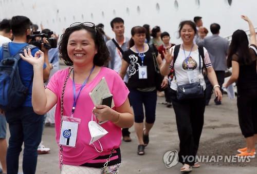 | △ '메르스 가고 유커 오고' (인천=연합뉴스) 윤태현 기자 = 9일 오전 인천시 중구 인천항에 정박한 중국 크루즈 '중화태산호'에서 중국 관광객들이 내리고 있다. 이 선박으로 한국에 입국한 중국 관광객 800여명은 이날부터 2박 3일 일정으로 인천지역 곳곳을 둘러볼 예정이다. 2015.7.9 tomatoyoon@yna.co.kr |