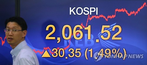 이날 코스피는 전 거래일보다 30.35포인트(1.49%) 오른 2,061.52으로 장을 마감하며 3거래일째 상승세를 이어갔다.