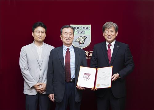 | △ 고려대에 10억원을 기부한 유휘성(가운데)씨, 유씨의 차남 선구(왼쪽)씨와 염재호 고려대 총장 << 고려대 제공 >> |