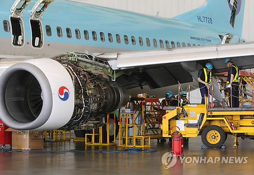 △ 서울 강서구 공항동 대한항공 본사 격납고에서 정비사들이 B737기 기체와 엔진 등 각종 장비와 부품을 검사하고 있다. (연합뉴스 자료사진)