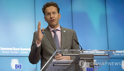 △ 그리스 '디폴트', '그렉시트' 없습니다 (아테네 AP=연합뉴스) 유로존(유로화 사용 19개국) 정상들은 16시간의 마라톤회의 끝에 13일(현지시간) 그리스가 추가 개혁안을 이행하는 조건으로 유럽재정안정화기구(ESM)와 3차 구제금융 협상을 개시하는 방안에 합의, '그렉시트'(그리스의 유로존 탈퇴) 우려가 해소됐다. 유로존 정상들은 그리스에 820억~860억 유로의 자금을 지원하고 ESM 협상을 마무리할 때까지 필요한 유동성을 지원하는 '브릿지론'으로 120억 유로를 별도로 제공하기로 했다. 사진은 이날 유로그룹(유로존 재무장관 협의체) 의장인 데이셀블룸 네덜란드 재무장관이 정상회동 결과를 설명하는 모습. bulls@yna.co.kr