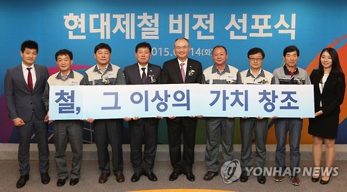 △ 현대제철 비전 선포식 (서울=연합뉴스) 14일 서울 양재동 현대제철 본사에서 열린 '현대제철 비전 선포식'에서 우유철 부회장(왼쪽 다섯 번째)과 강학서 사장(왼쪽 네 번째), 각 공장 노조지회장 등 참석자들이 현대제철의 새로운 비전인 '철, 그 이상의 가치 창조' 푯말을 들고 기념촬영을 하고 있다. 2015.7.14 << 현대제철 제공 >> photo@yna.co.kr