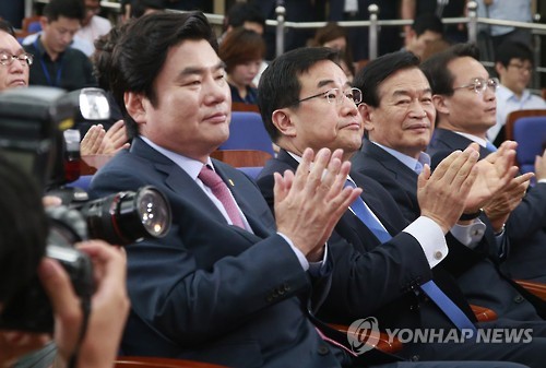 | △ 박수치는 새누리당 원내지도부 (서울=연합뉴스)이상학 기자 = 14일 오전 국회에서 열린 새누리당 의원총회에서 합의추대된 원유철 원내대표(왼쪽부터)와 김정훈 정책위의장이 김무성 대표의 발언에 박수를 치고 있다. 2015.7.14 leesh@yna.co.kr |