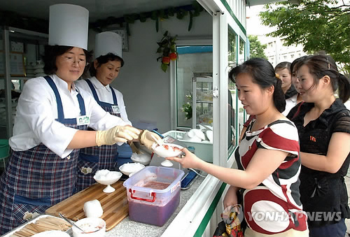 | △ 북한 주민도 여름엔 빙수 (평양 조선중앙통신=연합뉴스) 4일 평양 시내 상점에서 주민들이 빙수를 구입하고 있다. 2011.7.5 photo@yna.co.kr |