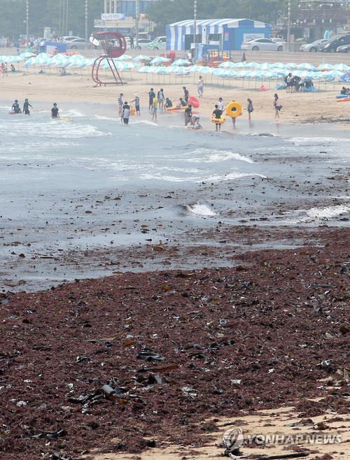 | △ 해초 몰려온 해수욕장 수영금지 (부산=연합뉴스) 조정호 기자 = 14일 부산 해운대구 송정해수욕장에 100t이 넘는 해초가 떠밀려와 해변가를 뒤덮고 있다. 해운대구는 제9호 태풍 찬홈이 지나면서 수중에 있던 해초가 해안가로 밀려온 것으로 추정했다. 해초가 밀려 온 300m 구간에 대해 입욕을 금지했다. 2015.7.14 ccho@yna.co.kr |
