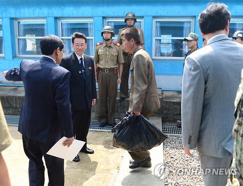 | △ 송환되는 북한 선원 (서울=연합뉴스) 지난 4일 울릉도 근해에서 구조된 북한 선원 5명 중 북측으로 돌아가기를 원하는 선원이 14일 판문점을 통해 송환되고 있다. 2015.7.14 << 통일부 제공 >> photo@yna.co.kr |