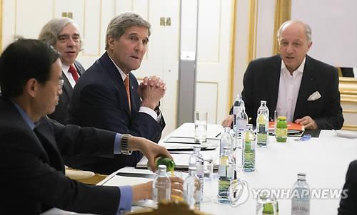 △ (빈 AP=연합뉴스) 이란과 주요 6개국(유엔 안전보장이사회 5개 상임이사국+독일)이 14일(현지시간) 13년 만에 역사적인 이란 핵협상을 최종 타결했다. 사진은 이날 오스트리아 빈소재 팔레 코부르크 호텔 회담장에 미국의 존 케리 국무장관(왼쪽 2번째 부터)과 어니스트 모니즈 에너지장관, 로랑 파비우스 프랑스 외무장관 등이 앉아 있는 모습.