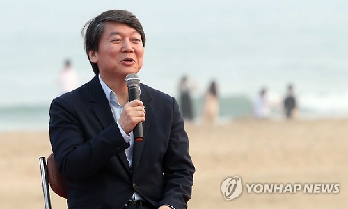 △ 안철수 '피서객과 수다' (부산=연합뉴스) 조정호 기자 = 안철수 의원이 14일 부산 해운대해수욕장에서 새정치민주연합 부산시당 산하 오륙도연구소가 마련한 '소통과 참여의 정책 서머페스티벌'에 참석, 사회자의 질문에 답하고 있다.