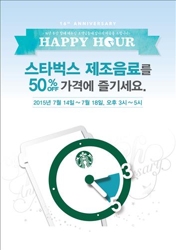 (서울=연합뉴스) 오예진 기자 = 스타벅스커피 코리아는 한국 진출 16주년을 맞아 오는 18일까지 5일간 오후 3∼5시에 모든 음료를 50% 할인하는 '해피아워' 행사를 한다고 14일 밝혔다.