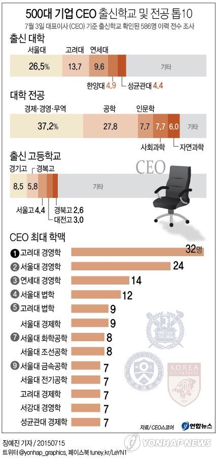 (서울=연합뉴스) 옥철 기자 = 국내 500대 기업 CEO(최고경영자)의 절반이 이른바 'SKY'로 불리는 서울대·고려대·연세대 출신인 것으로 나타났다.
