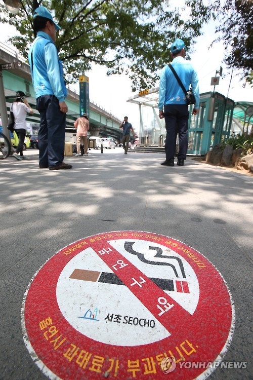 △ '지하철역 주변 10m 이내에서는 금연' (서울=연합뉴스) 서명곤 기자 = 서초구가 모든 지하철역 출입구 주변 10m 이내를 금연구역으로 지정하고 단속에 들어간 1일 오전 서울 서초구 사당역 부근에서 단속원들이 단속활동을 벌이고 있다. 사당역, 고속터미널역, 교대역, 양재역, 남부터미널역 등 서초구 내 22개 지하철역 출입구 총 121곳이 금연구역이 됐으며 이곳에서 흡연 시 과태료 5만원이 부과된다. 2015.7.1 seephoto@yna.co.kr