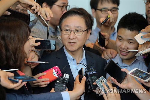 | △ 질문에 답하는 김신 삼성물산 사장 (서울=연합뉴스) 이정훈 기자 = 김신 삼성물산 사장이 15일 오전 서울 서초구 삼성 서초사옥에서 열린 사장단협의회을 마친 후 취재진을 만나 삼성물산과 제일모직의 합병 전망에 대한 질문에 답하고 있다. 2015.7.15 uwg806@yna.co.kr |