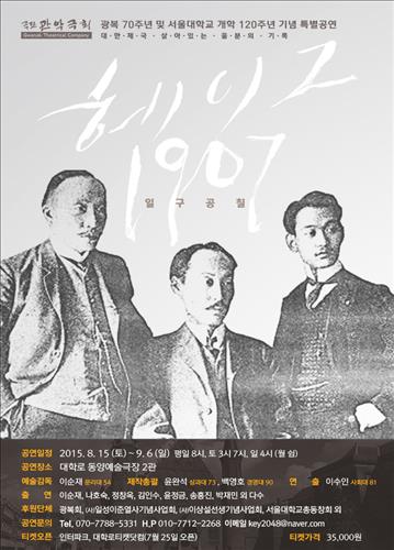 (서울=연합뉴스) 채새롬 기자 = 서울대 연극동문회 부설 관악극회는 서울대 개학 120주년과 광복 70주년을 기념해 연극 '헤이그 1907'을 광복절부터 9월 6일까지 공연한다고 15일 밝혔다.