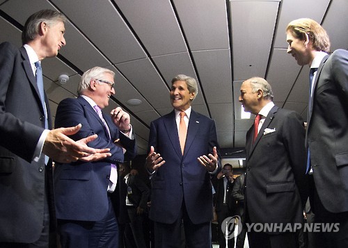 △ 18일 간의 마라톤 협상을 통해 이란 핵 문제 타결에 성공한 영국, 독일, 미국, 프랑스, 오스트리아(왼쪽부터)의 외무장관들이 14일 오스트리아 빈 유엔 유럽본부에서 축하 인사를 나누고 있다.(연합뉴스 사진DB)