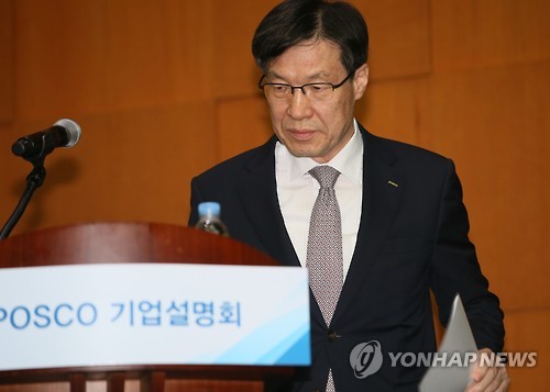 △ 권오준, 포스코 경영쇄신안 발표 (서울=연합뉴스) 진성철 기자 = 권오준 포스코 회장이 15일 서울 여의도 한국거래소에서 개최한 기업설명회에서 경영쇄신안을 발표하기 전 굳은 표정을 짓고 있다.