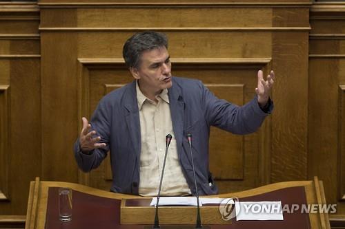 △ (아테네 AP=연합뉴스) 유클리드 차칼로토스 그리스 재무장관이 15일(현지시간) 의회에 출석해 구제금융 협상 개시 조건인 개혁법안 처리 필요성을 설명하고 있다.